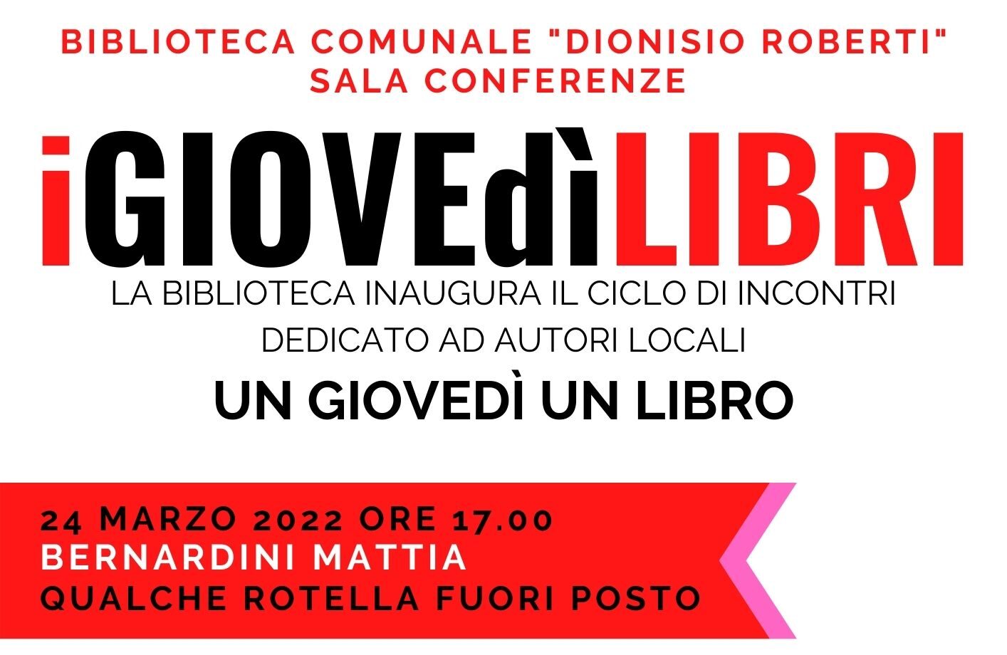 SANSEPOLCRO – Prende il via il ciclo di incontri con autori locali dal titolo “I giovedìlibri”. E’ una iniziativa della biblioteca comunale di Sansepolcro e il primo appuntamento è in programma giovedì 24 marzo con Mattia Bernardini e il suo “Qualche rotella fuori posto”.