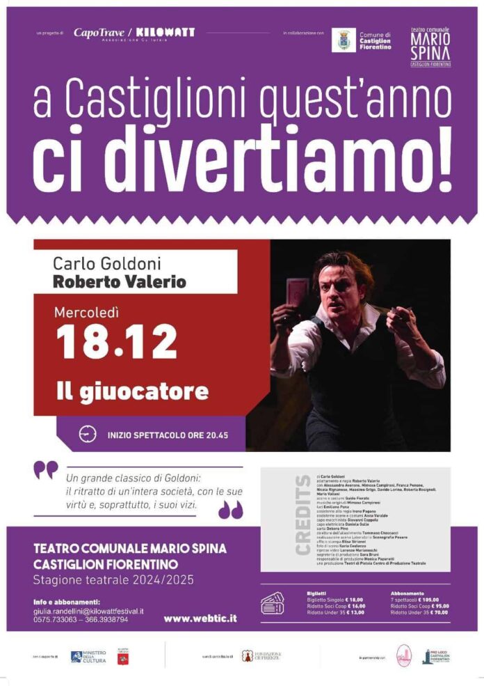 Secondo appuntamento, mercoledì 18 dicembre, con Il Giuocatore di Carlo Goldoni, adattato e diretto da Roberto Valerio, con Alessandro Averone, Mimosa Campironi, Franca Penone, Nicola Rignanese, Massimo Grigo, Davide Lorino, Roberta Rosignoli, Mario Valiani, una produzione Teatri di Pistoia Centro di Produzione Teatrale.