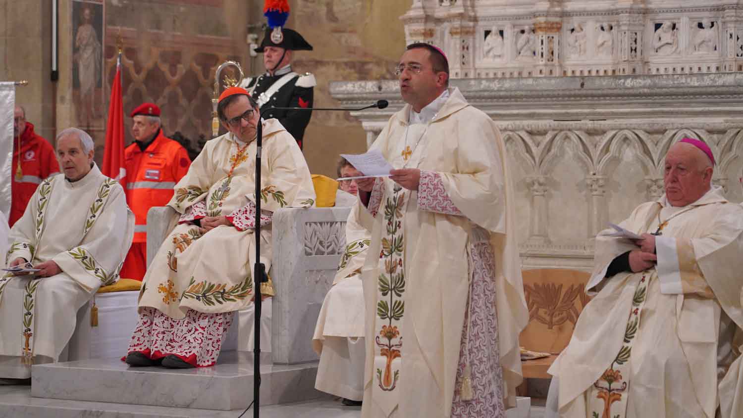 La Messa pontificale delle 10.30 è stata presieduta dal cardinale Augusto Paolo Lojudice, arcivescovo metropolita di Siena-Colle Val D’Elsa-Montalcino e vescovo di Montepulciano-Chiusi-Pienza e concelebrata dal cardinale Gualtiero Bassetti, arcivescovo emerito di Perugia-Città della Pieve e da altri sette vescovi, oltre a mons. Migliavacca (Franco Agostinelli, emerito di Prato; Benvenuto Italo Castellani, arcivescovo emerito di Lucca; Rodolfo Cetoloni, emerito di Grosseto, arcivescovo Riccardo Fontana, emerito di Arezzo-Cortona-Sansepolcro; Giovanni Paccosi, vescovo eletto di San Miniato; Marco Salvi di Civita Castellana; Alberto Silvani, emerito di Volterra).