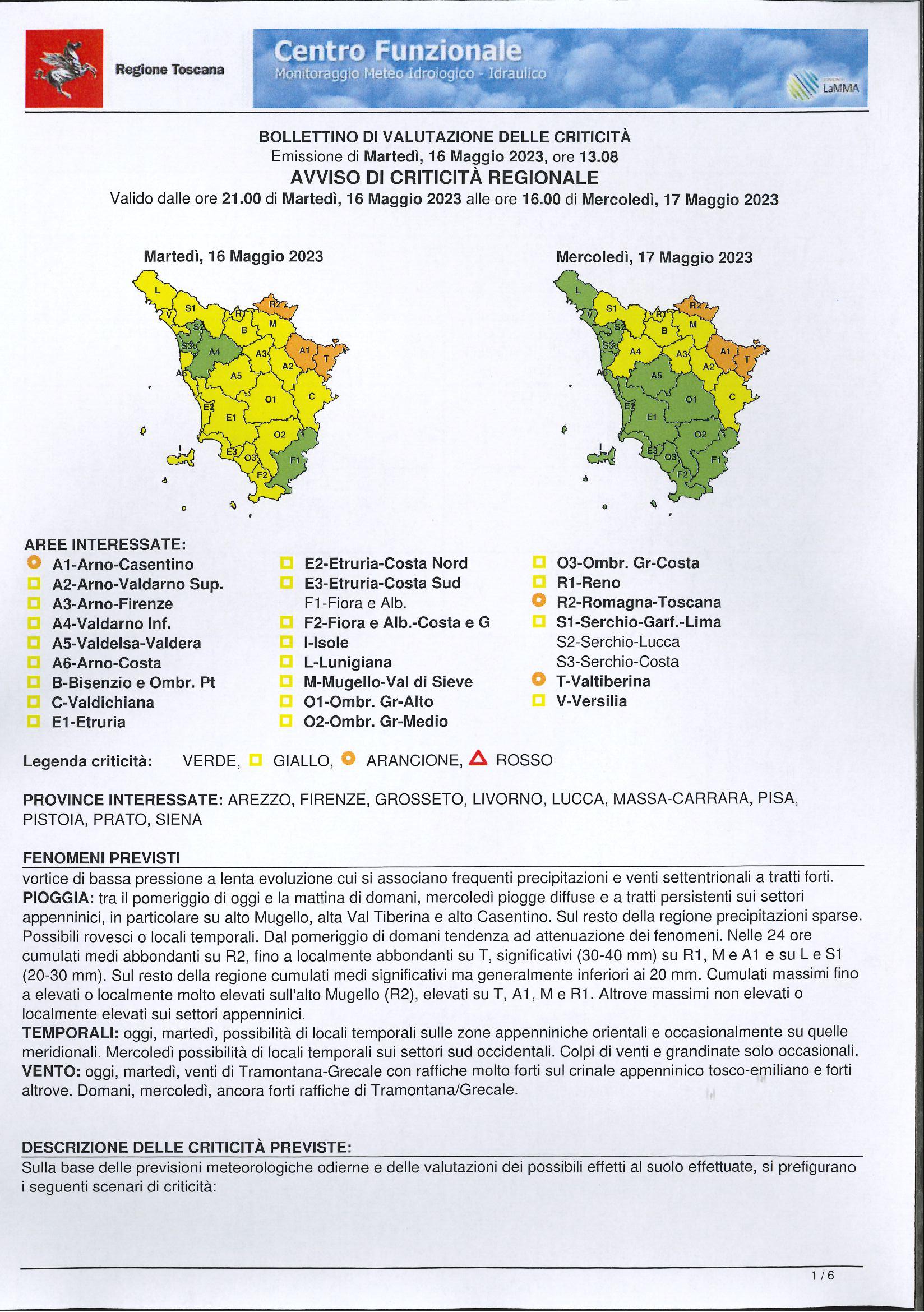 - codice ARANCIONE per rischio Idrogeologico dalle 21.00 di oggi alle 16.00 di domani mercoledì 17 maggio