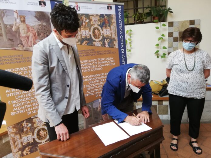SANSEPOLCRO – E’ stata presentata questa mattina la convenzione tra il Museo Civico di Sansepolcro e la Pinacoteca comunale di Città di Castello. Erano presenti i due assessori, Gabriele Marconcini e Vincenzo Tofanelli e i direttori, Maria Cristina Giambagli e Giuliana Zerbato. L’accordo punta a valorizzare due realtà che custodiscono un patrimonio artistico incalcolabile e ad agevolare gli accessi dei visitatori. La convenzione prevede infatti che chi visita uno dei due musei, abbia il biglietto ridotto per accedere all’altro. E’ una opportunità di cui si deve fruire entro 6 mesi dall’acquisto del primo biglietto.