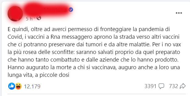 Scrive un noto giornalista televisivo sulla sua pagina Facebook: “E quindi, oltre ad averci permesso di fronteggiare la pandemia di Covid, i vaccini a Rna messaggero aprono la strada verso altri vaccini che ci potranno preservare dai tumori e da altre malattie. Per i no vax la più rosea delle sconfitte: saranno salvati proprio da quel preparato che hanno tanto combattuto e dalle aziende che lo hanno prodotto. Hanno augurato la morte a chi si vaccinava, auguro anche a loro una lunga vita, a piccole dosi“.